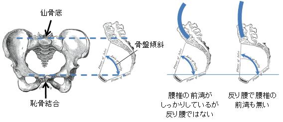 「反り腰」とは骨盤の前傾が強くなった状態を言います。 仙骨底と恥骨結合上縁を結ぶ線の傾きを骨盤傾斜と言い、解剖学的には直立した状態で55〜60度が正しい傾きだと言われています。 その骨盤傾斜が過度に大きくなっている状態が「反り腰」です。 したがって、下の図に示すように「腰椎の前湾」と「反り腰」とはイコールではないのです。