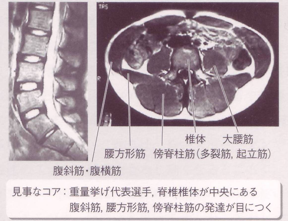 下の図は重量挙げの代表選手のMRIです。 腰椎が身体の中心部まで素晴らしい前湾を見せています。 しっかりした腰椎の湾曲と腰に悪いと言われている反り腰とは別物です。