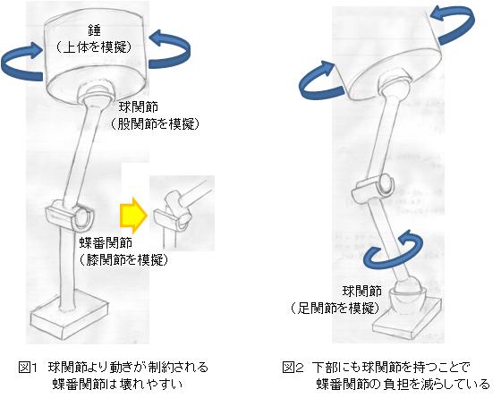 このように1方向にしか曲げられない膝関節の上下に3軸自在に動ける関節を組み合わせて、上体の自由な動きを可能にしているのです。
