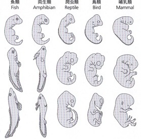 受精卵が分裂して人間の形になる初期発生の段階では、魚類・両生類・爬虫類・鳥類・哺乳類の間で、形が非常によく似ています。