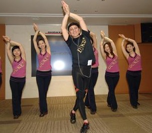 デューク更家のウォーキングエクササイズも、腕を挙げることで背筋を緊張させ、腰椎の前湾を作ります。