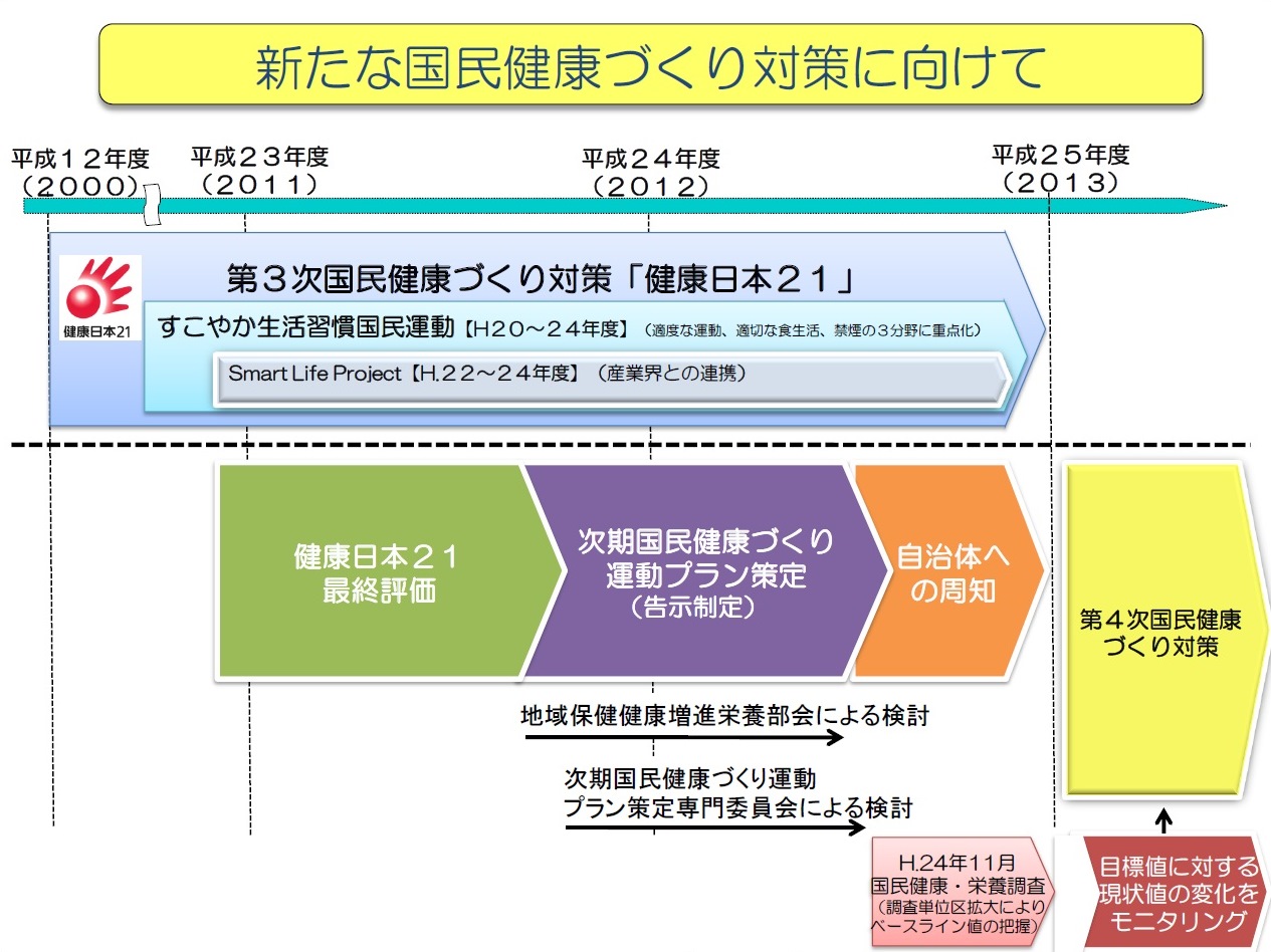 第3次国民健康づくり対策「健康日本21」が今年3月で終了し、2013年度(平成25年度)からは第4次国民健康づくり対策が始まります。