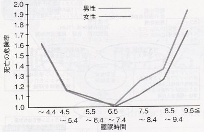 これを見ると、睡眠不足も寝過ぎも身体にとって良くなく、7時間前後が最も良いことが分かります。